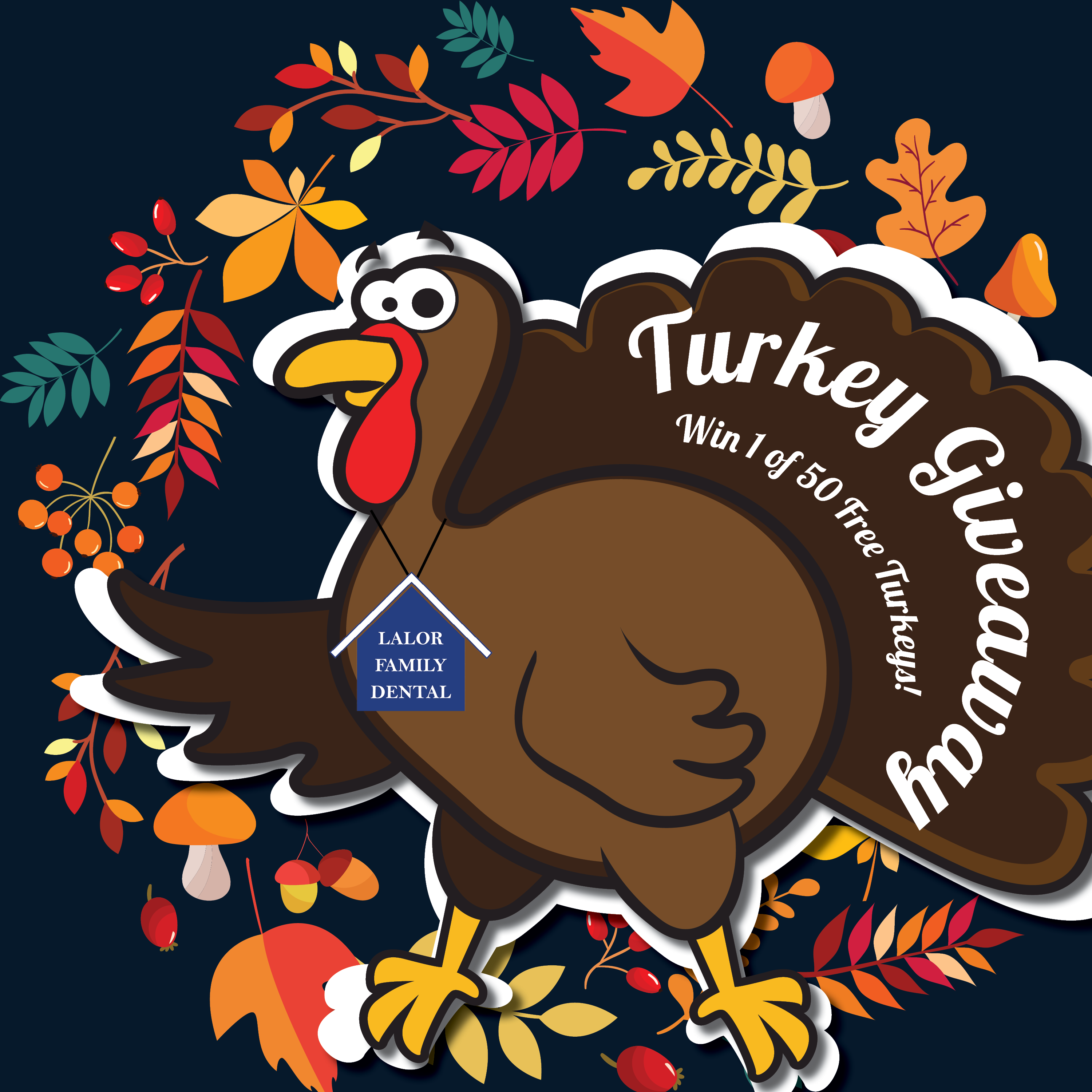 We are so thankful for all our patients! Our annual Turkey Giveaway event runs in November. Patients can enter by letting us know why you are thankful for Lalor Family Dental for a chance to win a free turkey! Keep an eye out for contest information online, in our newsletter, and at the office.